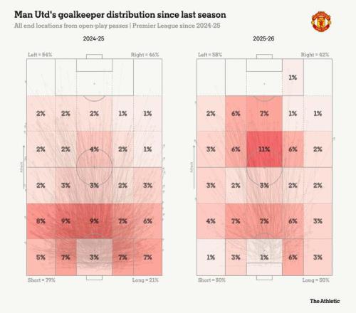 曼联场均23.2次门将长传是英超最多的——超过了在过去两个赛季一直领跑此项数据的埃弗顿——并且比阿莫林球队上赛季的长传数量增加了76%。